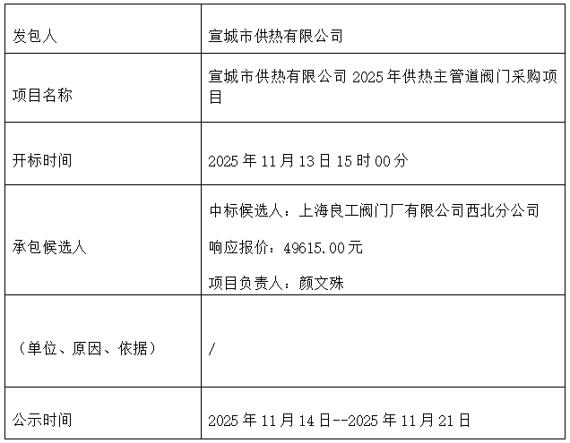 宣城市供热有限公司2025年供热主管道阀门采购项目结果公示