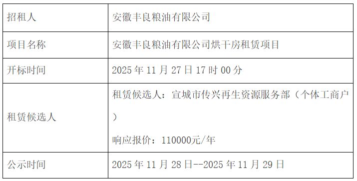 安徽丰良粮油有限公司烘干房租赁项目结果公示